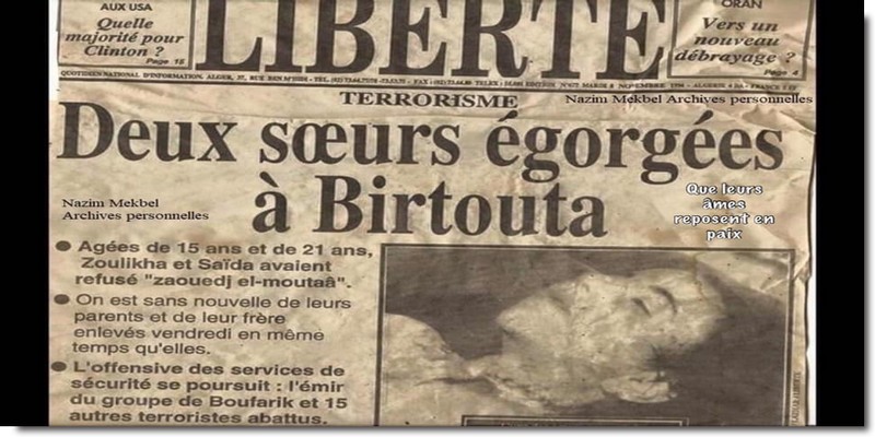Le 06 Novembre 1994, Boughedou Zoulikha et Saida 15 et 21 ans sont tuées à l’arme blanche puis décapites à Birtouta pour avoir refusé Zawadj El Moutaa. Elles avaient été enlevées le vendredi 04 novembre avec leur parents et leur frère à leur domicile à Sidi M’hamed.