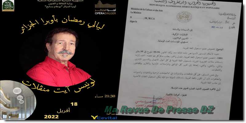 En effet, sur instruction de cette ministre, toutes les affiches du concert du chanteur Kabyle Lounis Ait Menguellet, devant se tenir à l’opéra d’Alger le 18 avril, sont présentées exclusivement en langue arabe.