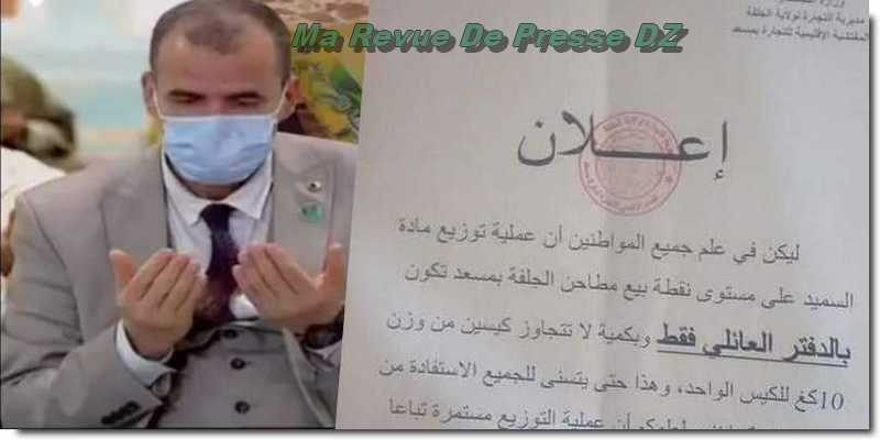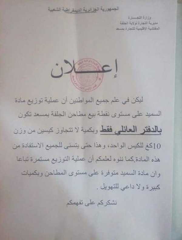 « Il est porté à la connaissance des habitats que l’opération de distribution de semoule au niveau des points de vente des semouleries de Djelfa à Messaad ne peut se faire que sur présentation d’un livret de famille (exclusivement). Chaque demande ne peut exèder deux sacs de 10 kg pour que tout le monde puisse y accéder. »