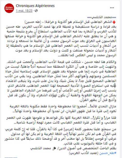 Il écrit entre autres : » après une lecture et une étude approfondie faite par Taha Hussein, ce dernier en a déduit que la poésie antéislamique dite « païenne » est un mensonge et un mythe fabriqué par les abbassides en Irak après la mort du prophète.