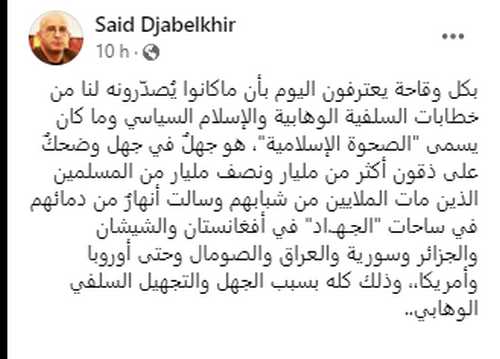 Said Djabelkhir : « Toute honte bue, et avec un culot incroyable, ils avouent aujourd’hui que ls discours salafo-wahabite et de l’islam politique est une aliénation. Et ce qu’ils appelaient « SAHOUA ISLAMIA » (Renaissance islamique), est aliénation sur aliénation et qu’ils ont ri de plus de un milliard et demi de musulmans. Des musulmans, dont plusieurs millions sont morts et ont vu leur sang coulé dans des théâtres du ‘jihad » en Afghanistan, en Tchétchénie, en Algérie, en Syrie, en Irak et en Somalie. Et même en Europe et en Amérique. Toutes ces vies anéanties à cause de l’aliénation salafiste et wahabite… »
