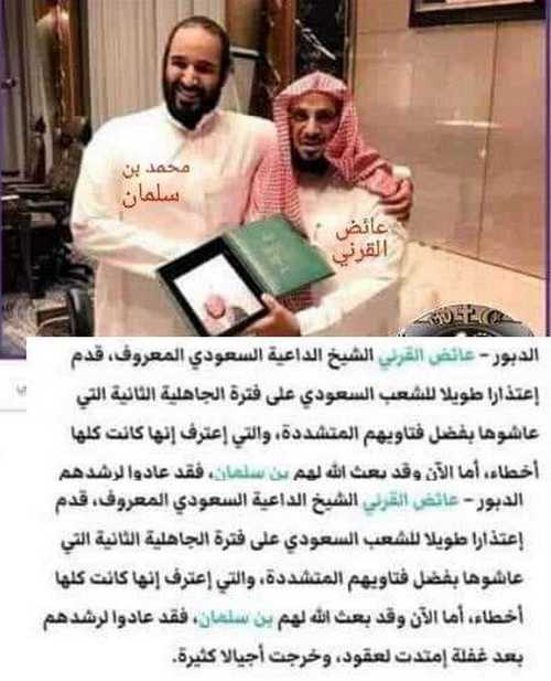 Le célèbre cheikh salafo-wahabite Aid al-Qarni a, dans un long discours, présenté ses excuses aux saoudiens sur ce qu’il qualifie de « période obscurantiste » dans laquelle les fetwas obscurantistes salafo-wabites ont plongé la société. Il a ainsi qualifié ces avis religieux d' »erreurs », ajoutant que son dieu « Allah » a, désormais, envoyé Benselman pour entreprendre une grande réforme de l’islam. Le prince héritier saoudien qui, dit-il, les a « sorti de l’obscurantisme dans lequel nous étions engloutis »