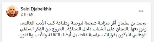 Said Djabelkhr : « Mohamed Ben Salman a décidé de consacrer un budget pharamineux pour la traductions d’œuvres littéraires universelles. Il a décidé de les distribuer gratuitement aux jeunes dans le royaume. Sortir de l’idéologie salafiste-wahabite ne peux se faire que par la politique, mais également par la culture, la littérature et les arts ».