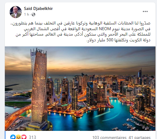 Said Djabelkhir : « Ils nous ont exporté le discours salafiste et nous ont laissé noyé dans le sous-développement, alors qu’eux se développent. Sur la photo, la ville Saoudienne de Néom dans le nord-ouest de ce royaume sur la mer rouge. Cette ville va être la ville la plus intelligente du monde. Sa superficie est plus grande que l’Etat du Koweït et va couter 500 milliards de dollars ».