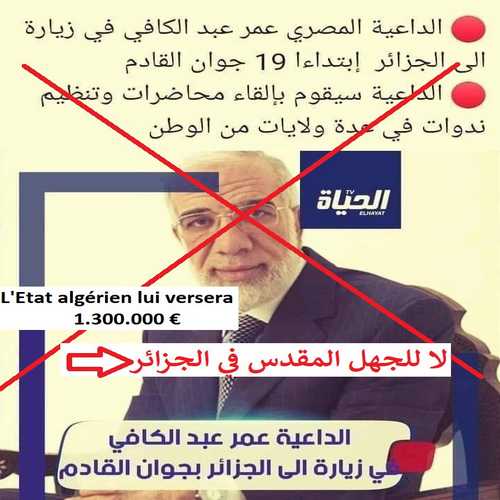 Plusieurs pages facebook font état, ces derniers jours, du montant qu’aurait perçu le prédicateur Égyptien Omar Abdelkafy invité officiel de l’État Algérien et qui a commencé son cycle de conférences à travers plusieurs mosquées et universités du pays. Ainsi, certaines pages évoquent la coquette somme de 1.3 million d’euros pour 12 conférences. Soit prés de 108.000 euros pour chaque conférence. Sur la page « Ni islamiste, Ni militaire », on peut retrouver cette publication parue le 12 juin :