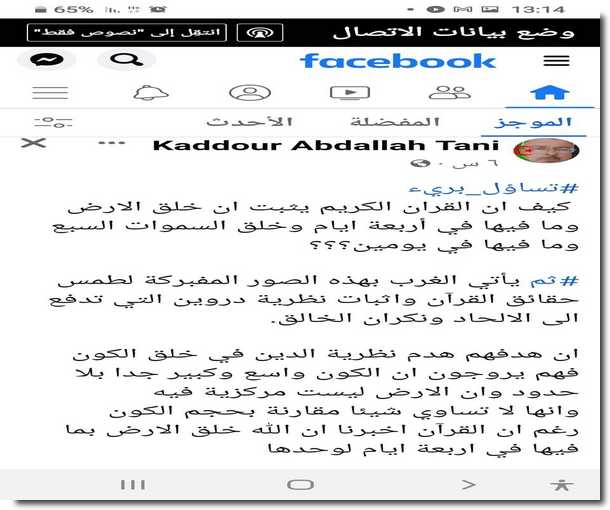 « Le Coran nous apprend que Allah a créé la Terre et tout ce qu’elle contient en 4 jours. Puis il a créé les sept ciels et ce qu’ils contiennent en deux jours. Et l’occident vient nous brandir cette photo fabriquée pour dénigrer les vérités du Coran. Cet occident veut juste prouver la théorie de Darwin qui pousse à l’athéisme en niant l’existant du créateur.