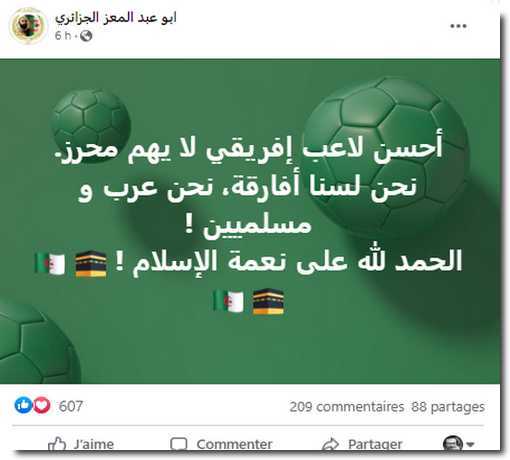 « Le trophée du meilleur joueur africain ne concerne pas Mahrez. Nous ne sommes pas africain. Nous sommes arabes et musulmans. Gloire à Allah de nous avoir fait musulmans ».