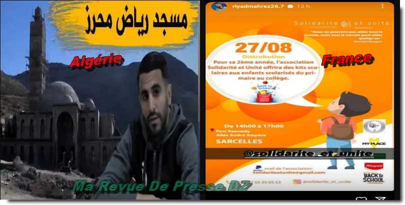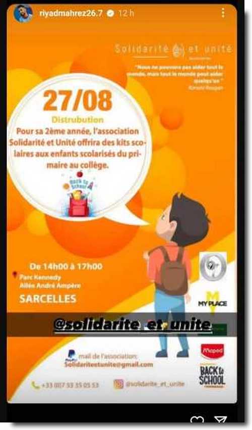 Ainsi, la star fraco-algérienne a lancé une campagne de volontariat avec une organisation caritative à Sarcelle, dont la mission est de collecter des fournitures scolaires pour les élèves du primaire et du collège. Mahrez a publié sa démarche caritative à travers une story sur sa page officielle Instagram. Dont le slogan s’intitule « Solidarité et unité ».