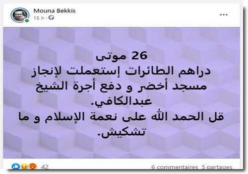 Mouna Bekkis : « 26 morts. L’argent des avions bombardiers d’eau a été utilisé pour construire une mosquée verte et payer la facture de cheikh Abdelkafy. Rend grâce à Allah et arrête de te plaindre ».