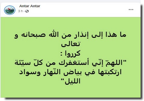 Antar Antar : « Il ne s’agit là que d’un avertissement de notre seigneur Allah. Répétez cette invocation : « ô Allah pardonne moi tous les péchés que j’ai pu commettre depuis la lueur du jour jusqu’à l’obscurité de la nuit ».