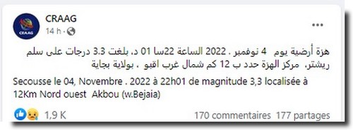 Rappelons que dans la nuit de vendredi 4 novembre à 22h01 le Centre de Recherche en Astronomie Astrophysique et Géophysique (CRAAG), a annoncé qu’une secousse de 3.3 sur l’échelle de Richter a été enregistrée à Bejaia, ajutant que l’épicentre est situé à 12kms Nord Ouest d’Akbou.