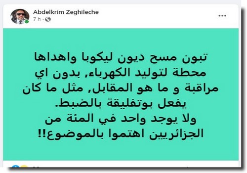Abdelkrim Zeghileche : « Tebboune a effacé la dette de Cuba et a offert à ce pays une centrale électrique, sans le moindre contrôle, ni cointrepartie. Exactement comme faisait Bouteflika. Pas un pour cent des algériens ne se sont préoccupés du sujet !!! »