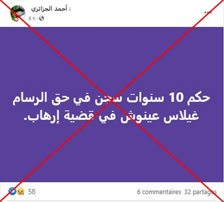 Plusieurs pages facebook relaient que le tribunal de Bejaia a condamné le caricaturiste Ghilas Aïnouche à 10 ans de prison pour terrorisme.