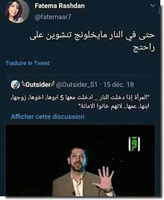 Fetwa : » Si une femme va en enfer, 5 hommes de sa famille l’accompagneront parce qu’ils n’auront pas été à la hauteur. Soit, son père, son mari, son fils, son frère et son cousin. »