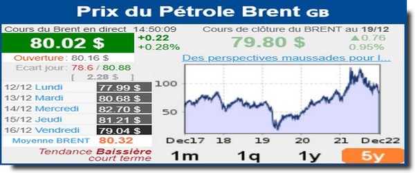 Le prix du baril de Brent de la mer du Nord, pour livraison en février, a gagné 0,96%, pour clôturer à 79,80 dollars. Quant aux baril de West Texas Intermediate (WTI) américain, pour livraison en janvier, il a lui pris 1,21%, à 75,19 dollars.
