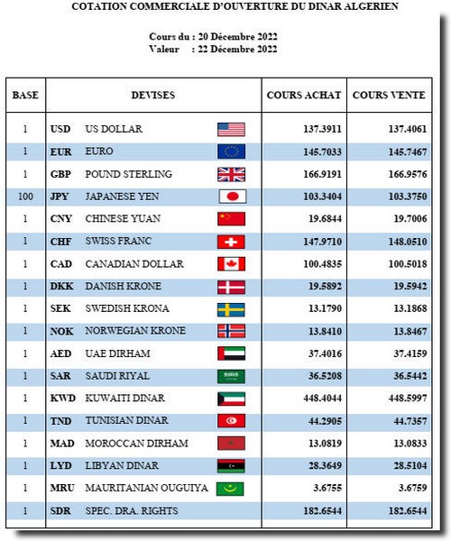 Au niveau du marché officiel, l’Euro s’échange contre 145.70 DA à l’achat et 145.74 DA à la vente. Le dollar américain, de son côté, s’échange contre 137.39 DA à l’achat et 137.40 DA à la vente.