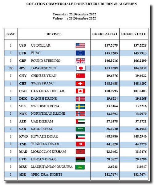 Au niveau du marché officiel, l’Euro s’échange contre 145.92 DA à l’achat et 145.99 DA à la vente. Le dollar américain, de son côté, s’échange contre 137.20 DA à l’achat et 137.22 DA à la vente.