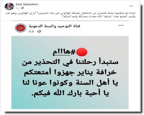 « Pourquoi n’avez vous pas lancé de campagne pour avertir sur la dangerosité de la fête païenne Halloween célébrée à la Mecque ? Ou est-ce qu’elle est devenue une fête Hallal et conforme à l’islam recomandée par vos maîtres ? »