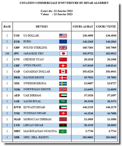 Taux de change du 14 janvier 2023