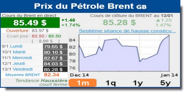 Le prix du baril de Brent de la mer du Nord, pour livraison en mars, s’est élevé de 1,48%, pour clôturer à 85,28 dollars. Le prix du baril de West Texas Intermediate (WTI) américain, pour livraison en février, a lui pris 1,87%, à 79,86 dollars. Le WTI a frôlé, en séance, les 80 dollars, un seuil psychologique qu’il n’a plus franchi depuis 10 jours.