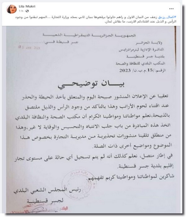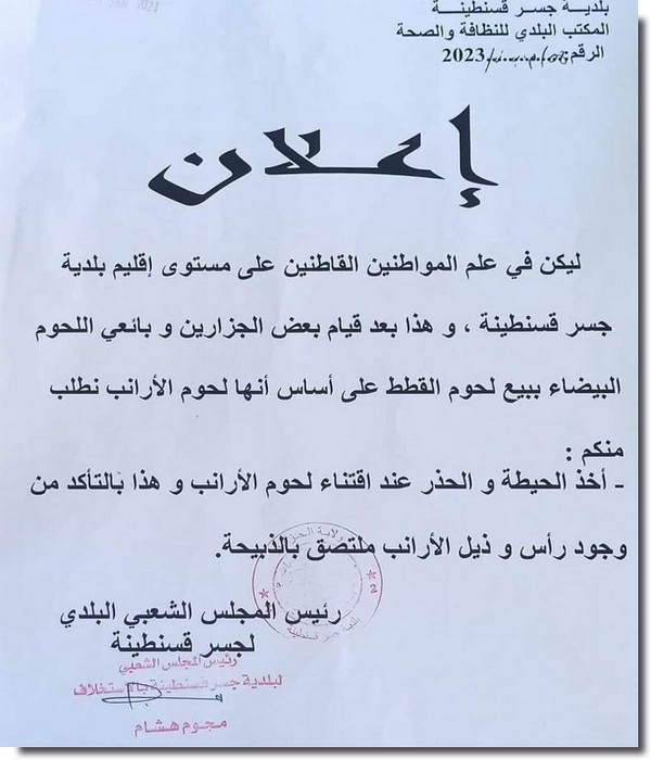Nous informons les habitants de la commune de Gué de Constantine, que certaines boucheries et vendeurs de viandes blanches mettent en vente de la chair de chat en la faisant passer pour du lapin.