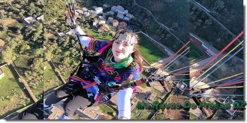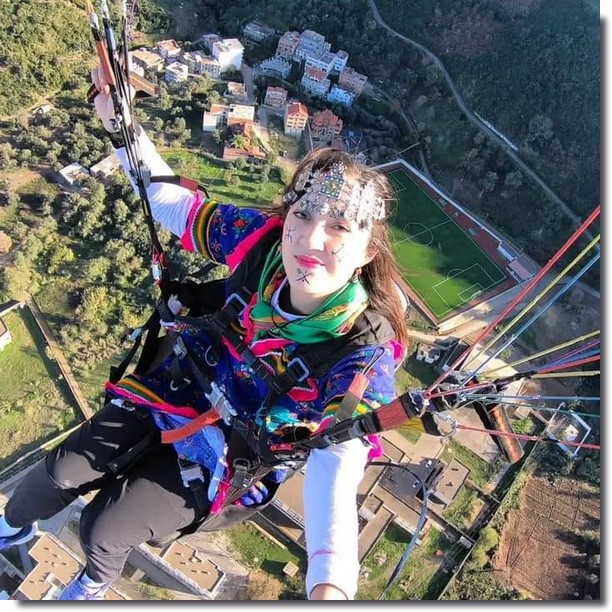 La championne d’Algérie parapente Mixte, Hayat Aissat a présenté ses vœux pour le nouvel an amazigh, YENNAYER 2973, d’une façon pour le moins originale. C’est, en effet, dans les airs, via le ciel d’Aokas, sur son parachute qu’elle s’est prise en photo vêtue d’une robe kabyle et le visage maquillé de tatouages Amazigh. Un cliché qui fait le bonheur des internautes sur les réseaux sociaux.