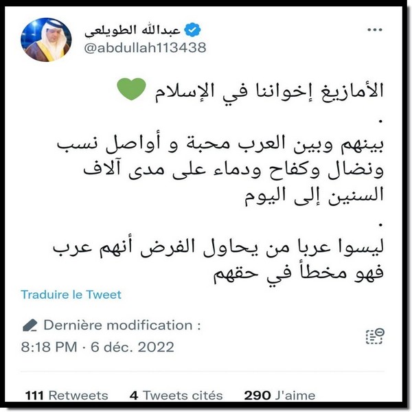 Abdullah Al Touwailai : « Les Amazighs sont nos frère en islam. Entre les amazighs et les arabes existent une amitié et des combats communs durant des centaines d’années à nos jours. Cependant, ils ne sont pas des arabes. Et ceux qui tentent d’imposer qu’ils sont arabes commettent une faute grave envers eux. »
