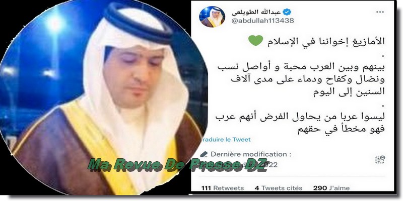 Abdullah Al Touwailai : « Les Amazighs sont nos frère en islam. Entre les amazighs et les arabes existent une amitié et des combats communs durant des centaines d’années à nos jours. Cependant, ils ne sont pas des arabes. Et ceux qui tentent d’imposer qu’ils sont arabes commettent une faute grave envers eux. »