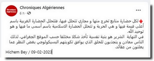 Dans une publication sur sa page facebook « Chronique Algériennes » relaie le post du militant Hichem Bey. Ce dernier a, en effet publié, des commentaires d’internautes algériens évoquant le séisme qui a frappé la Turquie et la Syrie et dont les morts se comptent par milliers…