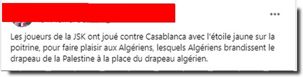 Dans le commentaire d’un internaute ayant relayé le montage on peut lire : « Les joueurs de la JSK ont joué contre Casablanca avec l’étoile jaune sur la poitrine, pour faire plaisir aux Algériens, lesquels Algériens brandissent le drapeau de la Palestine à la place du drapeau algérien. »