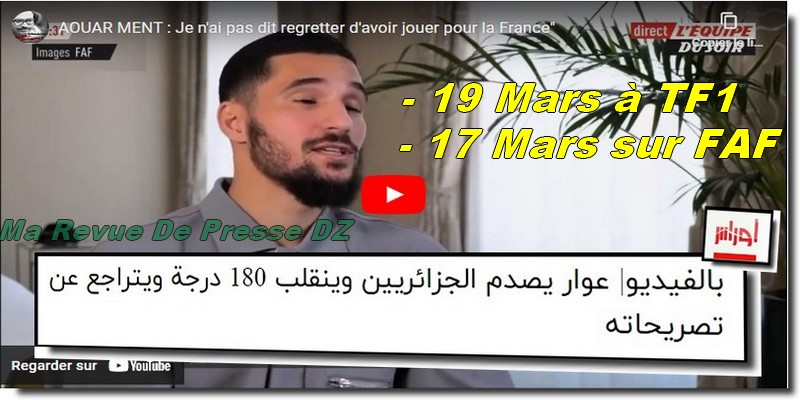 Sous le titre « Aouar choque les algériens et fait un revirement de 180° sur ses déclarations », le site publie un extrait d’une interview accordée à TF1 pour l’émission Téléfoot, qui doit être diffusée ce dimanche. Cet extrait a été publié par le journaliste Yacine Nafaoui sur sa page facebook.