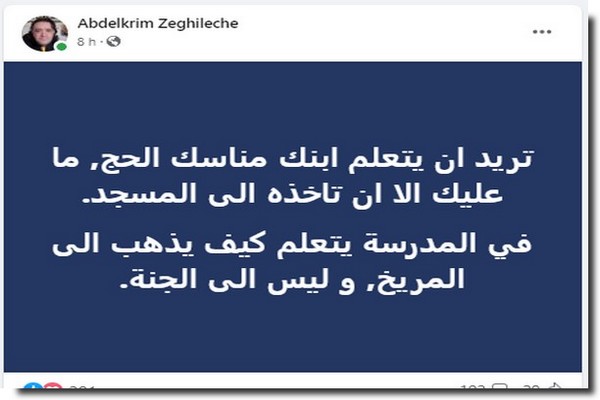Abdelkrim Zeghileche : « Si tu veux que ton enfant apprenne les rituels du Hadj emmène-le à la Mosquée. A l’école, il va apprendre comment aller sur Mars pas au paradis ».