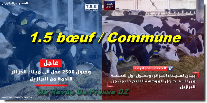 Le 19 mars 2023, plusieurs médias rapportaient en grande pompe avec mention « URGENT », qu’à l’approche du mois de Ramadan, le communiqué du port d’Alger annonçant l’arrivée de 2500 bœufs importés du Brésil pour faire face à la flambée des prix des viandes qui atteignent 15 à 20% du SMIG le kilo.