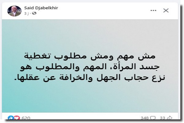 Said DJabelkhir : « Il n’est pas nécessaire, ni demandé de voiler le corps de la femme. Le plus important est de retirez le voile de l’ignorance et de l’archaïsme de la tête »