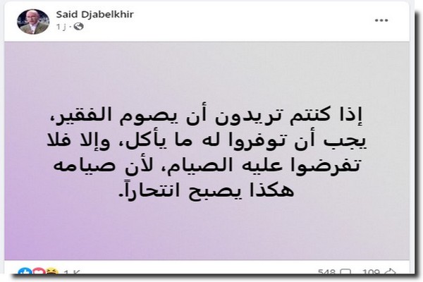 A 48h du Ramadan, de nombreux échanges sur les réseaux sociaux portent sur cette thématique. Sur sa page facebook, l’islamologue Said Djabelkhir y est allé de son commentaire et n’a pas manqué de faire réagir de nombreux internautes.