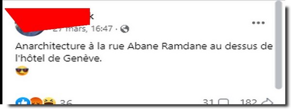 Selon l’internaute qui relaie la photo, l’immeuble se situe sur un des principaux boulevards de la capitale : « Rue Abane Ramdane, au dessus de l’hôtel Genève ».