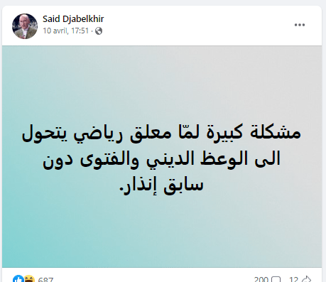 Ainsi, aprés la cuisinière Oum Walid la semaine écoulée, l’islamologue Said Djabelkhir évoque « un journaliste sportif » qui s’est lancé, cette semaine, dans un prêche religieux sur un support médiatique.