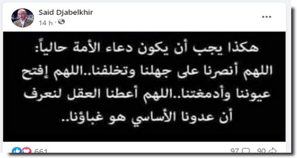 Said Djabelkhir : « Voilà comme doit se faire le Douaa de la société musulmane de nos jours : Allah, protége-nous de notre ignorance et de notre sous-développement. Allah ouvre-nous les yeux et nos cerveaux. Allah donne-nous la clairvoyance pour comprend que notre principal ennemi et notre bêtise. »