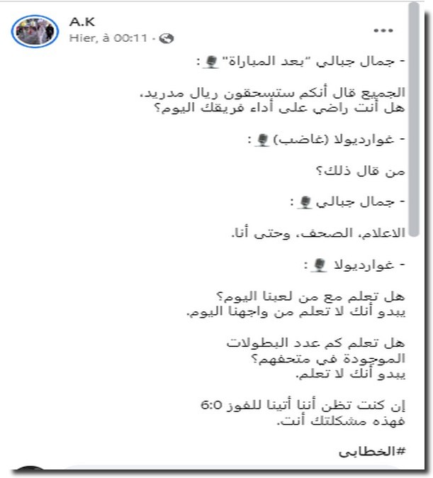 Sur sa page facebook, le journaliste sportif Al Khatabi (A.K) a rapporté l’échange entre Pep Guardiola et le journaliste algérien Samir Djabali.