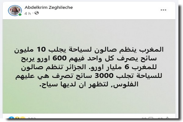Abdelkrim Zeghileche : « Le Maroc organise un Salon du Tourisme et attire 10 millions de touristes. Chaque touriste dépense En moyenne 600 euros. Ce qui fait engranger au trésor public marocain 6 milliards d’euros. L’Algérie quant à elle, organise un Salon du Tourisme et paye les séjours à 3000 touristes pour donner l’impression qu’elle a un secteur du Tourisme ».