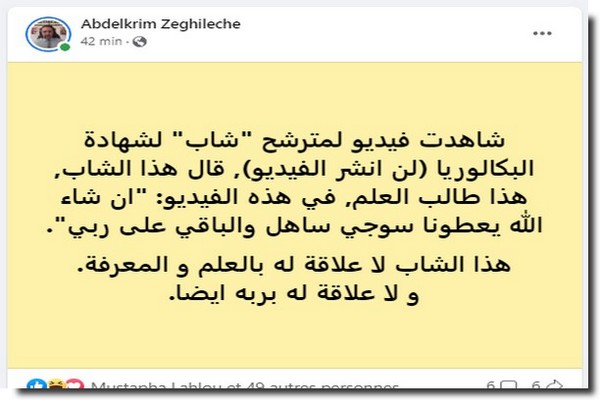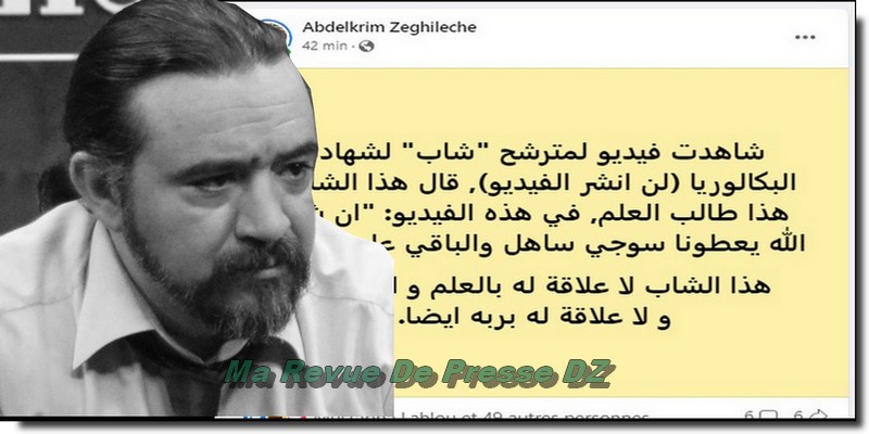 Abdelkrim Zeghileche : « J’ai vu une vidéo d’un jeune candidat au bac (je ne publierai pas la vidéo). Ce jeune dit : « Inchallah ils vont nous donner un sujet facile et Allah fera le reste ». Ce jeune n’a ni de relation avec les science, ni avec les connaissances ni même avec son dieu ».