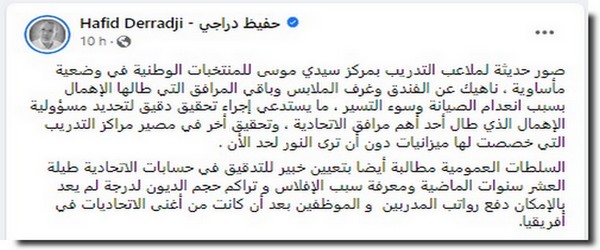 Hafid Derradji : « Photos récentes du terrain d’entrainement au niveau du centre de sidi Moussa des sélections nationales. Un état désastreux qui ne touche pas seulement le terrain, mais également l’hôtel, les chambres et toutes les infrastructures du fait de la mauvaise gestion et de l’absence d’entretien (…) ».