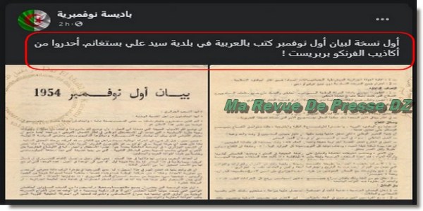 “La déclaration du 1er novembre a été rédigée en Arabe à Mostaganem”, selon des internautes algériens